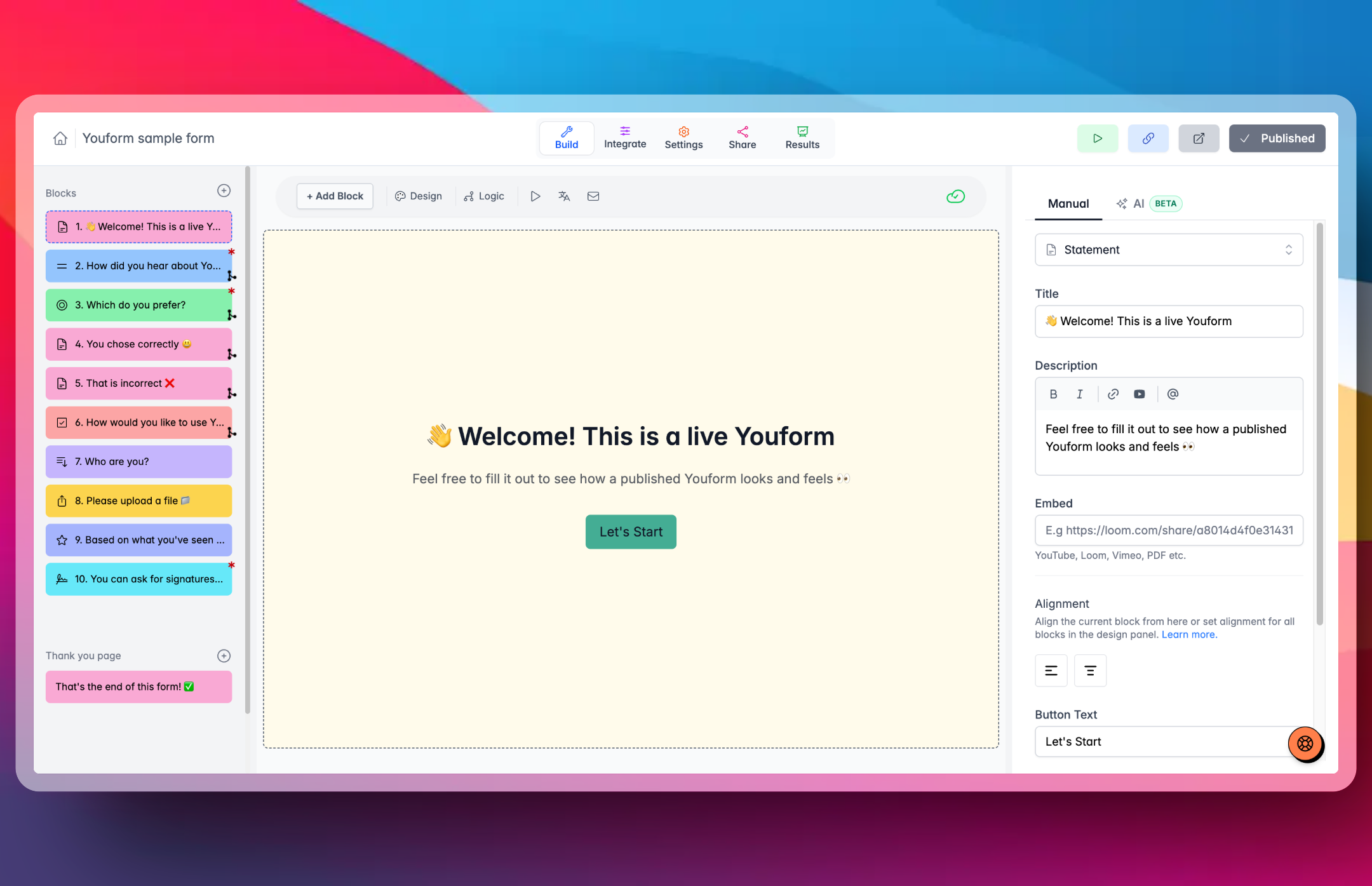 Tally's builder is not made for "one question at a time" form structure. Sure, you can add pages, but the flow of the final form doesn't feel like as smooth as other builders like Typeform or Youform.